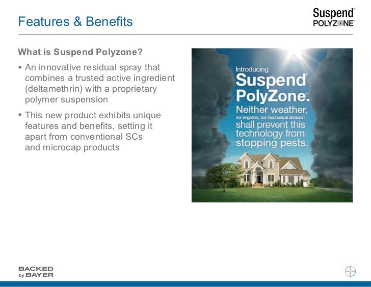 Suspend poly zone features a proprietary polymer that protects the active ingredient deltamethrin from weather irrigation Mechanical abrasion. 612019 32916 AM. Suspend SC is designed for use both indoors and outdoors and will provide effective knockdown and long residual control of the pests listed on this label.